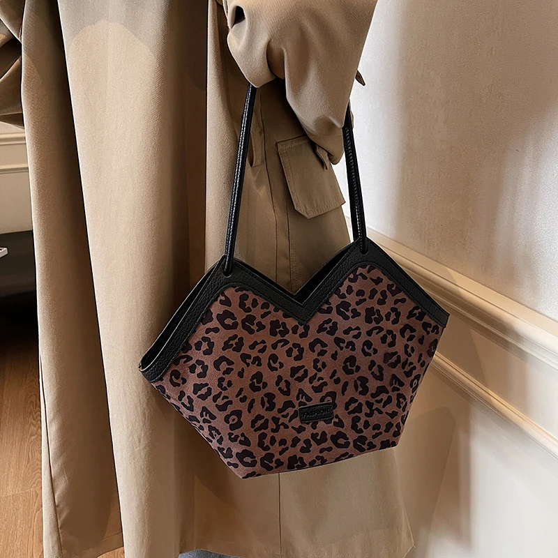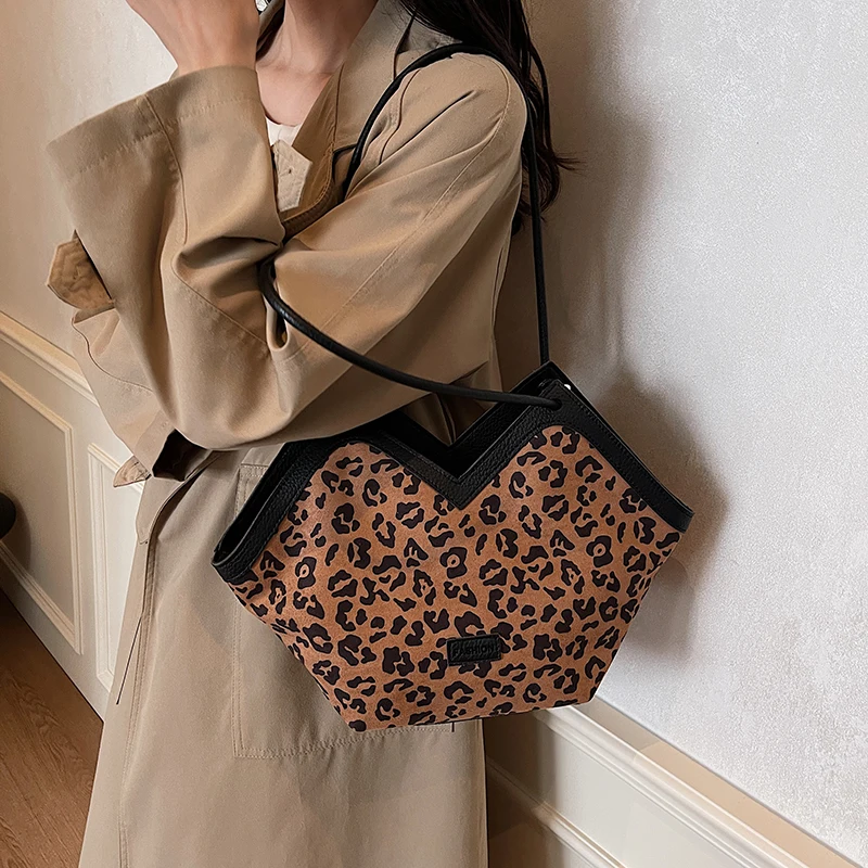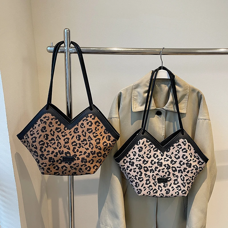 Leopard Print Faux Suede Large Capacity Heart Shaped Handbag